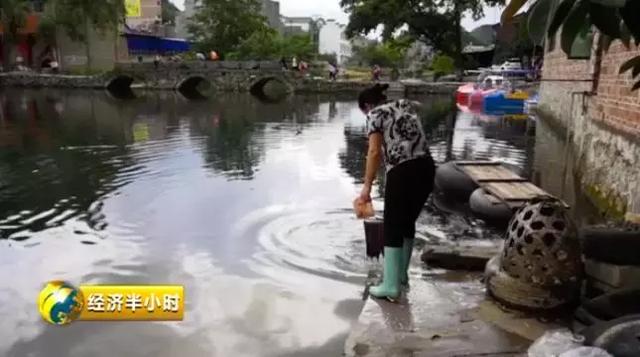 村民在八宝河里洗拖把