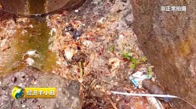 在沙址村前的一条水沟里,被倾倒了大量的餐厨垃圾,这里蚊蝇肆虐,发出一阵恶臭,通过墙体的痕迹、以及垃圾的厚度和颜色判断,在这里倾倒餐厨垃圾已经有很长时间。当地村民说,尽管有回收垃圾的地方,可是他们还是乱倒。