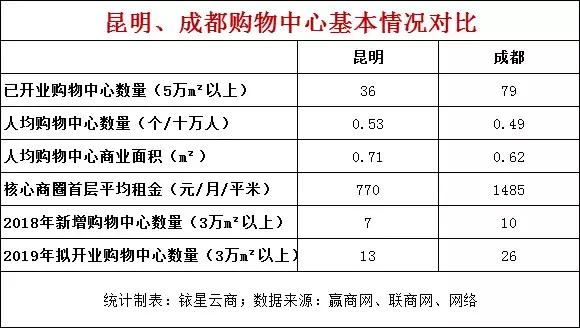 虽然成都购物中心数量高于昆明,但是却在人均数量和人均商业面积方面逊于后者,不过租金又大大超出后者。