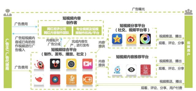 我们以短视频产业链为主,短视频内容的创作者产生内容,通综合平台发布,再分发给分享与推荐平台,最后到用户的手中,一起形成一个基本框架。
