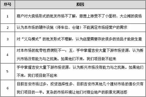 在正式启动招商之前,必然要对整个市场环境进行细致分析,而目前本项目面临的一个大问题就是如何吸引老市场的优质商户进驻本项目。经过调研分析,目前老市场的商户普遍对项目不看好,深究其原因有一下几点: