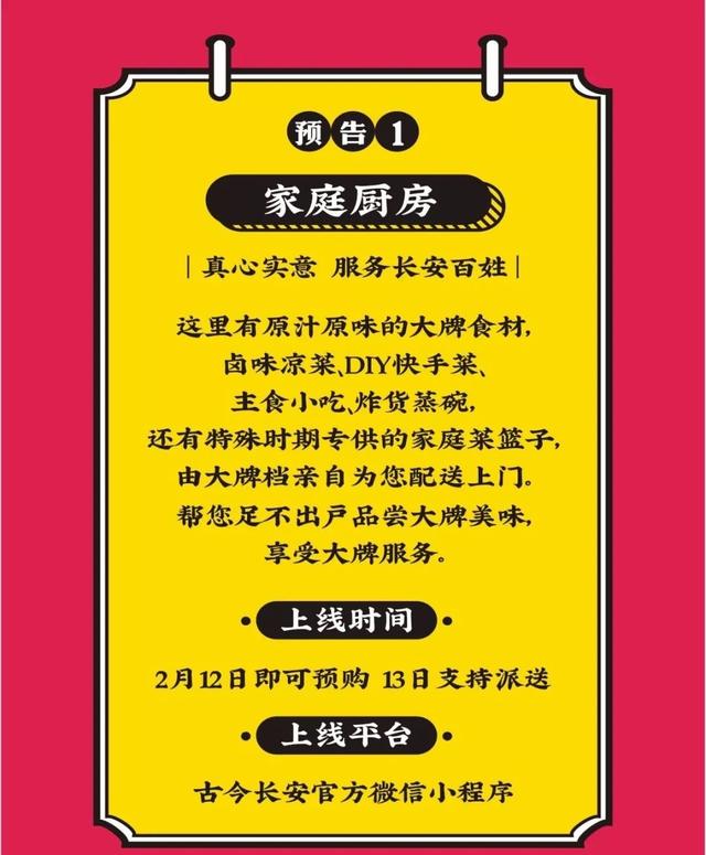 除此之外,长安大牌档专为疫情时期启动三大板块,分别为家庭厨房、大牌外卖、企业定制。从家庭到企业,从食材到团餐,长安大牌档考虑到了方方面面。据悉,家庭厨房已于2月13日支持派送,大牌外卖将于2月16日在饿了么、美团app上线,企业定制团餐2月18日起将接受客服预定。