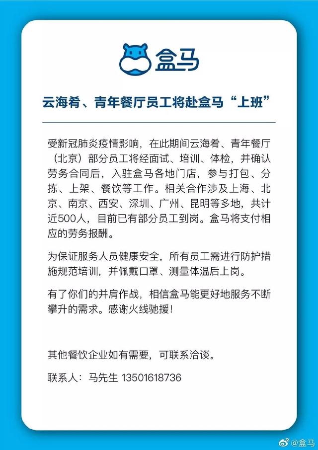 盒马全国经营管理总经理胡秋根表示,1月31日,盒马(北京)总经理李卫平最早在内部会议上提出“联合餐饮同仁共抗疫情”的设想,解决当下用工问题。之后,李卫平很快联系到北京商委和烹饪协会辗转找到云海肴,双方当场达成一致,次日便开始有员工陆续到盒马“上班”。盒马与云海肴共同宣布达成人员用工合作,不仅解决餐饮企业的人员待岗问题,也缓解了盒马人力不足的挑战。
