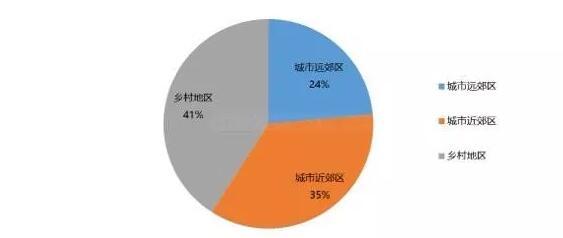 这张图是分析了中国第一批127个特色小镇之后得到的一些数据,从区位特点上看,特色小镇与城市的关系可以分为三种类型:大城市近郊、大城市远郊和乡村地区。从图中可以看出,乡村地区的特色小镇最多,占到了41%,其次是大城市近郊区占35%。