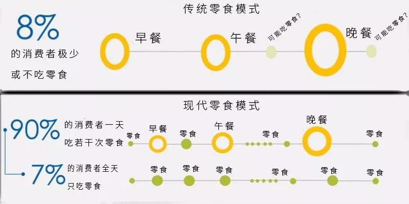 市场咨询公司 technomic 2014 年的消费者趋势报告中已经显示,49% 的人会在正餐中间吃零嘴,而 45% 的人每周会用零食取代一两顿正餐。2015年,市场咨询公司hartman的研究表明,零食场景已经占据了所有用餐场景的 50%,90% 的消费者一天要吃若干次零食,而且多数零食消费并不是下意识开了袋薯片无意识放进嘴里——80% 的零食都是“蓄谋已久”、目的明确地被吃掉的。
