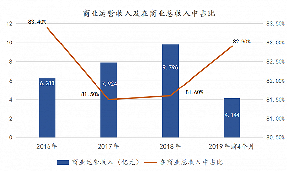 随着在管建筑面积的增加,宝龙商业运营收入也在逐步增加。截止2016年末、2017年末、2018年末以及2019年前4个月的为止,商业运营收入分别为6.283亿元、7.924亿元、9.796亿元、4.144亿元,在商业总收入中占比均在80%以上。