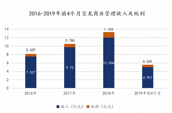 另据宝龙商业管理的招股书的数据显示,宝龙商业管理2016年、2017年、2018年以及2019年前4个月的收入分别为7.527亿元、9.73亿元、12.004亿元、4.997亿元,扣除各项成本后,纯利分别为0.629亿元、0.786亿元、1.333亿元、0.549亿元,呈现逐每年稳步上升趋势。