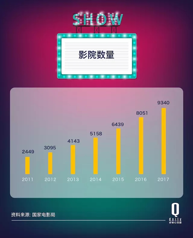 分水岭是 2015 年,这一年国内影院开始加速扩张。影院数量从 2014 年底的 5158 家,增长到 2017 年底的 9340 家;银幕数量从 23592 块,增长到 50776 块,数量全球第一。
