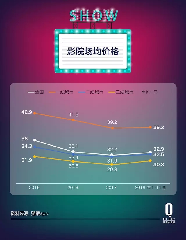 产能过剩,竞争激烈,场均观众人数减少,行业格局依然分散,直接结果就是影院没有提高票价的能力。不管是从全国来看,还是分一、二、三线城市来看,2018 年的票价都比 2015 年的时候便宜。