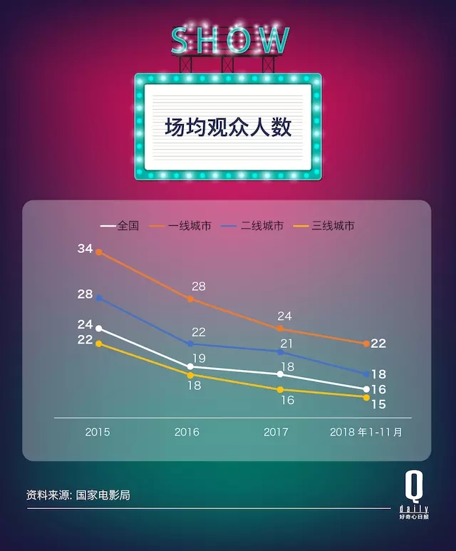 首先,每场电影的观众数量在持续减少。 2015 年的时候,全国范围内每场电影可以吸引 24 个观众,到了今年,每场平均只有 16 个观众了。即使是最大的院线公司也未能幸免,万达在 2015 年场均有 40 个观众,但今年也只有 22 人了,几乎下降了一半。