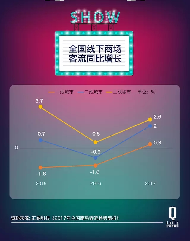 线下商场近几年的客流量本就处于基本停滞状态。根据专门为商场、购物中心测量客流数据的汇纳科技所公布的数据,2015-2017 年,一二线城市商场客流基本没增长,只有三线城市维持着 3.7%、0.5%、2.6%的增长。