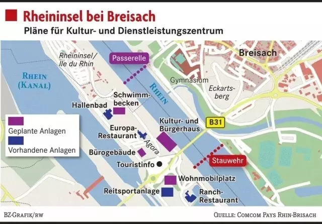 规划方案目前已经完成。2015年,来自欧洲的128个建筑师事务所参加了该项目招标。最终,法国米卢斯的克莱恩事务所与德国弗莱堡的吉斯事务所(两者共同参与规划)于2016年10月签订了建筑设计合同。他们在设计中很巧妙地结合了当地地形:三层楼高的文化与市民中心直接位于岛屿较低侧的莱茵河岸,上层高度接近岛上的主干道。该处将修建行人通道,直接通往建筑物北端的大型观景台,人们在这里可以获得更开阔的视野--从布莱萨赫的教堂到德国莱茵河岸。