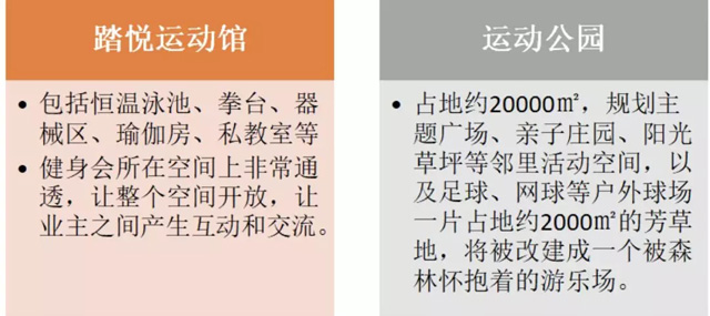 主要包括室内运动馆、运动公园、户外球场、彩色及观景慢步跑道等。