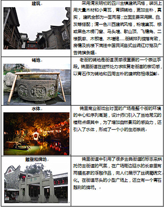成都锦里文化商业街是旅游商业街中典型代表,本篇文章围绕成都锦里的街道规划、广场设计、景观元素、节点空间以及空间营造五个方面分析成都锦里作为都市旅游休闲街区的基本规划与设计。