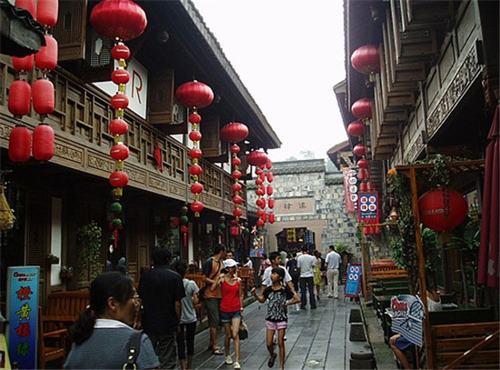 锦里旅游商业街的规划上借鉴了成都传统街道自由生长的有机排列方式,整个街道初宽后窄,此种做法增加了街道的透视感和连续性,中间设有广场作为空间序列的高潮,由热闹狭窄的街道过渡到开阔的广场,让人豁然开朗。