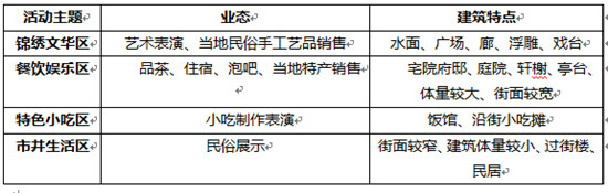 锦里街道内沿街的建筑并非直线型排列,建筑前的阴角空间多数被沿街的店铺用作室外的餐饮、休息场所,出挑的屋檐可以遮挡风雨。广场处的空间呈现半围合状态,戏台是整个广场的视觉中心,开敞的两边由水面围合,既扩大了广场的视域又给人以被围合的安全感。