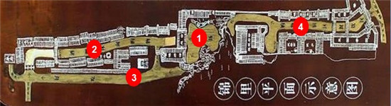 锦里商业街分为四个板块,分别是1锦绣文华区,2餐饮娱乐区,3名特小吃区和4市井生活区。