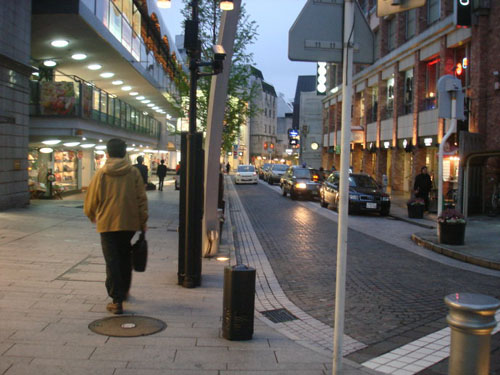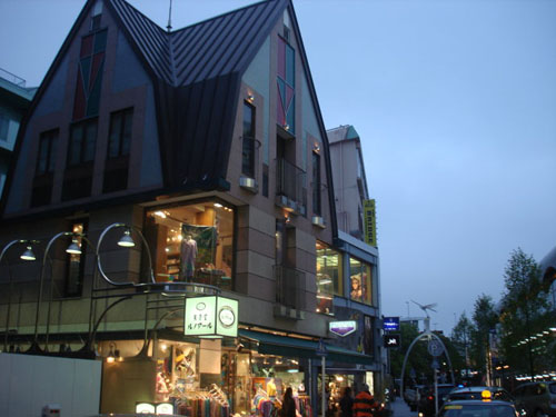 店铺皆笔直临街,步行街马路人为设计成弯曲,增加情趣与休闲感
