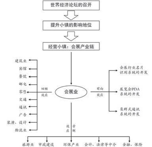 大事件的把握是指依托于某个大事件的发生,经营城镇的一种方式,往往具有偶然性。最典型的代表为达沃斯小镇 ( davos ) ,1987 年召开的世界经济论坛 ( wef ) 成就了达沃斯小镇,而会址选择于此,只是因为论坛创始人施瓦布先生酷爱滑雪。小镇海拔高 ( 是阿尔卑斯山系最高的小镇 ) ,四面环山,空气干爽清新,对保健有极大帮助,因此 19 世纪末,铁路开通后,达沃斯逐渐以疗养胜地闻名于欧洲,并建设了众多的医院等医疗设施。如今,作为 wef 年会会址,在会展业的回顾效应、前向效应及旁侧效应的作用下,商务服务设施需求增加,产业链逐渐完善,小镇也发展成为阿尔卑斯山区最大的度假胜地、体育和会议中心 ( 图 7、图 8 ) 。