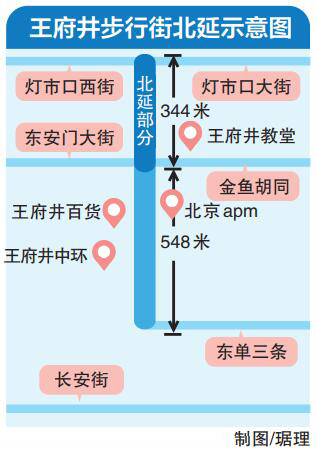 结合大街两侧设施功能的完善,步行街延长工作将分阶段推进,其中2019年向北延长344米到灯市口大街和灯市口西街。