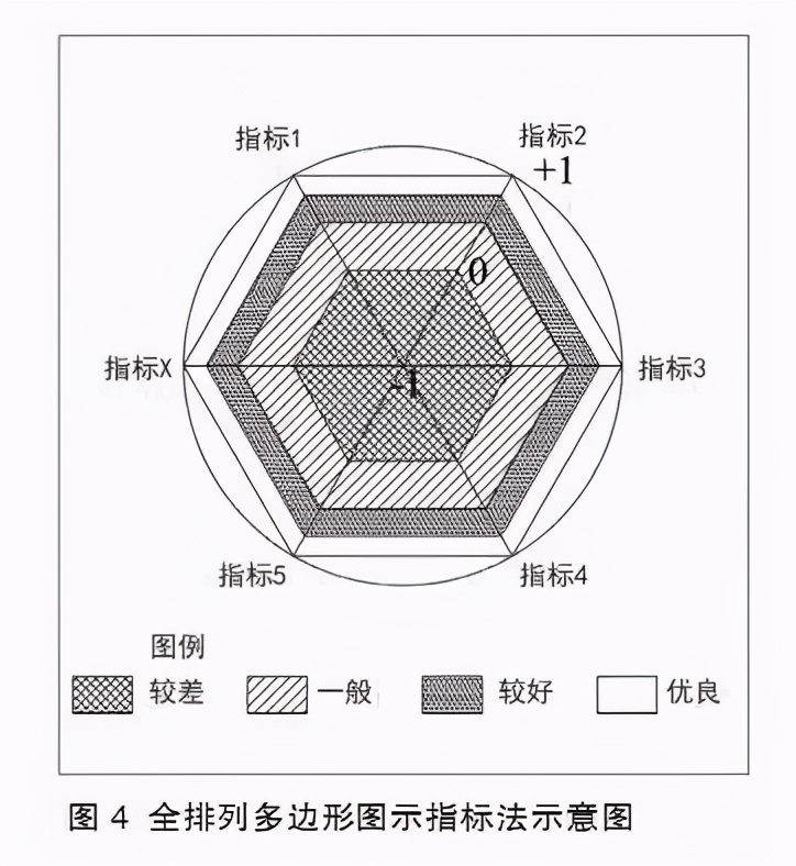 各指标值标准化采用双曲线标准化函数,将各指标值标准化到-1~1,使所有维度的指标标准化值都能构成一个正多边形的雷达图。将两极和4个维度作为综合指数,综合发展水平指数构成的多边形中心点到顶点的线段为各综合指标标准化值所在区间[-1,1],而标注值0为临界线,0以下其值为负,0以上其值为正(图4)。