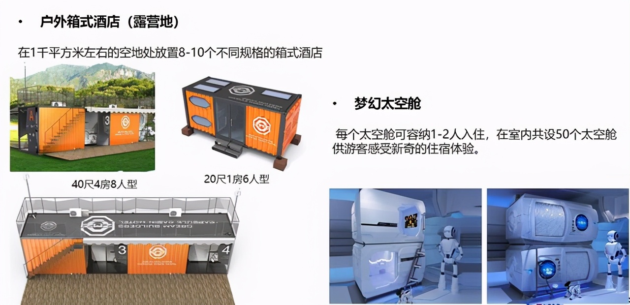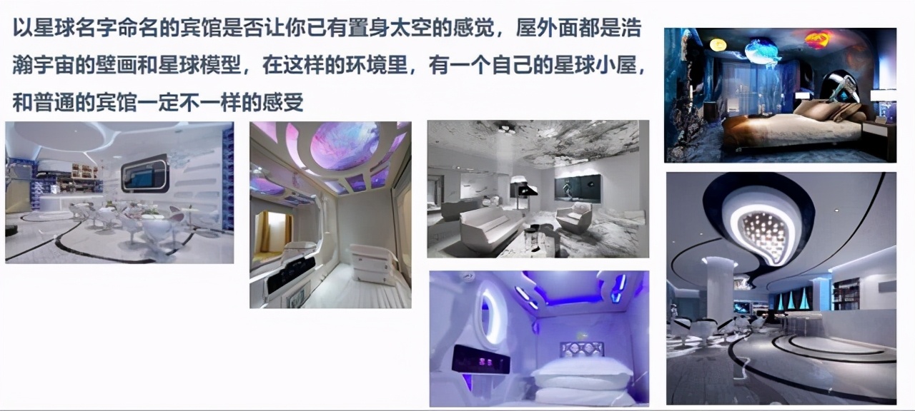 在园区内设立航天文化主题酒店、经济适用型酒店等。酒店设计从航空视觉设计、听觉设计、触觉设计、味觉设计等方面综合起来,共同构成顾客的体验。酒店内部设有多种带有故事色彩的主题房间,包括梦幻宇宙、火星着陆、银河星系、玉兔登月等。