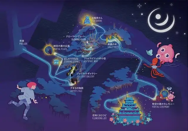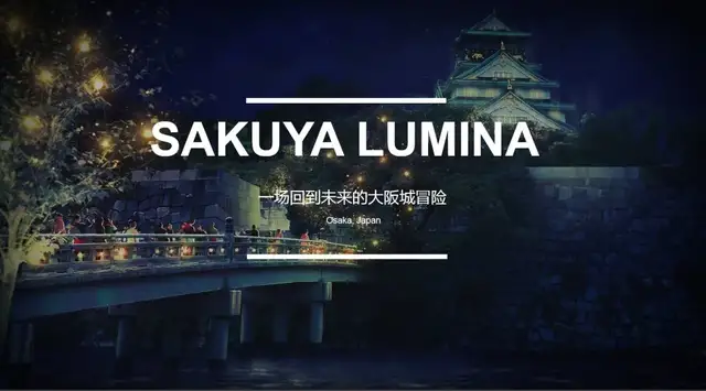 “sakuya lumina”不是简单的灯光秀,而是一个身临其境的故事。故事内容是一个生活在未来大阪的女孩,名字叫akiyo,时 光倒转在大阪城公园迷失了回家的路,游客们与akiyo一起努力 寻求回家之路的穿越时空之旅。这次户外多媒体体验项目,通过 灯光、音景、场景、视频内容和互动功能来激发人们的情感。幻想的声音和全息投影的效果与大坂城的自然融合,交互式的数字艺术将你引入故事的世界。