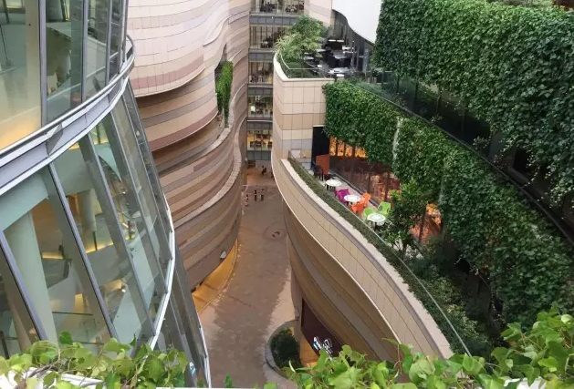 这种奇特的建筑结构,让人们从周围风格冷酷的线型建筑中抽身,欣赏成群的大树、岩石、悬崖、草坪、溪流、瀑布池塘及露台,游离于城市之上的自然绿洲,享受体验式购物的乐趣。