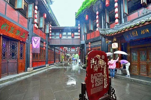 历史悠久的锦里古街,由成都武侯祠博物馆恢复修建,是成都市著名的商业步行街。作为武侯祠的一部分,街道全长550米。