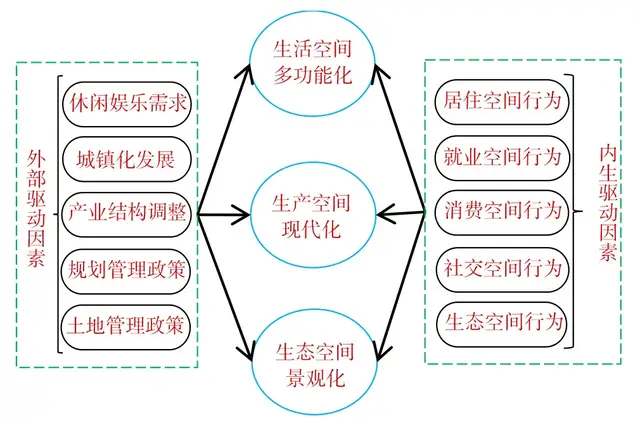 特色小镇空间结构的形成和演变是其内部、外部各种力量共同作用的结果,是人与自然长期相互作用的过程,并且会随着经济发展水平的提高和社会的进步而不断地发生变化。水果特色小镇的规划建设应遵循“三生”空间的演变规律,达到生产空间、生活空间、生态空间的完美融合。图2为“三生”空间与水果特色小镇建设的目标衔接图,从中可以看出,水果特色小镇规划建设受外部驱动因素和内生驱动因素的共同影响,外部驱动因素来自于休闲娱乐需求、城镇化发展、产业结构调整、规划管理政策、土地管理政策等因素,内生驱动因素则来自于乡村居民的居住空间行为、就业空间行为、消费空间行为、社交空间行为、生态空间行为等要素。在内外因素作用下,特色小镇逐渐实现生活空间多功能化、生产空间现代化、生态空间景观化,形成可持续的特色小镇三生空间系统。