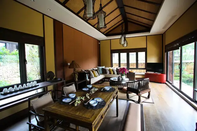 客栈:占比约20%。拈花湾目前有13家禅意客栈:一花一世界、吃茶去、棒喝、一池荷叶、半窗疏影、门前一棵松、萤火小墅、芦花宿、百尺竿、云半间、一轮明月、无门关、无尘。这些客栈在禅意风格的设计思路下,使用原木和棉麻材质,处处隐喻东方美学的质朴。每间客栈独有一个禅意主题,每个主题都有一个禅意故事。度假公寓:占比约15%。在项目内部除了酒店、客栈之外,还大量开发建设有度假公寓类产品,有院落式、联排式两种建筑类型;房间有标间、大床房、家庭套房三种类型。现目前为商业性质度假公寓类产品,对外销售,非自住投资者将公寓统一交由禅意村舍运营管理。