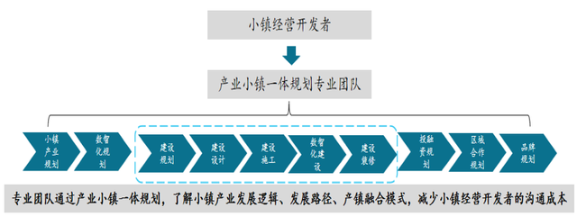 对于缺乏建设经验的小镇开发者,在小镇建设过程中与建设规划、建设设计、施工、装修等多方专业团队进行反复沟通无疑是一项巨大的工程;而这些专业机构的痛点则是对于小镇产业意图和小镇公众构成的不了解,导致反复沟通和修改。因此从产镇一体化规划牵头,进行专业团队之间的沟通和融合,才是小镇建设能够价值最大化的关键。