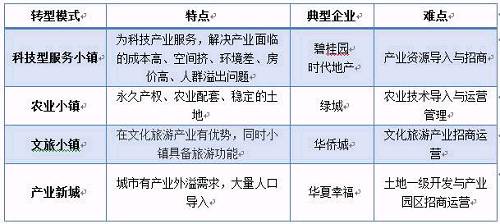 对于房企而言,借助较低成本获得大量土地开发权,并在后续运营中持续获得稳定的现金回报,是特色小镇最大的亮点,而房企转型特色小镇越靠近地产转型越容易成功,传统的房地产开发远郊大盘或产业园区,包装成小镇就能受到政府和客户的追捧,实际上,与传统房地产大盘开发不同的是,特色小镇或许更注重持续的运营能力。就全国性房企纷纷试水特色小镇,总结出4种转型模式: