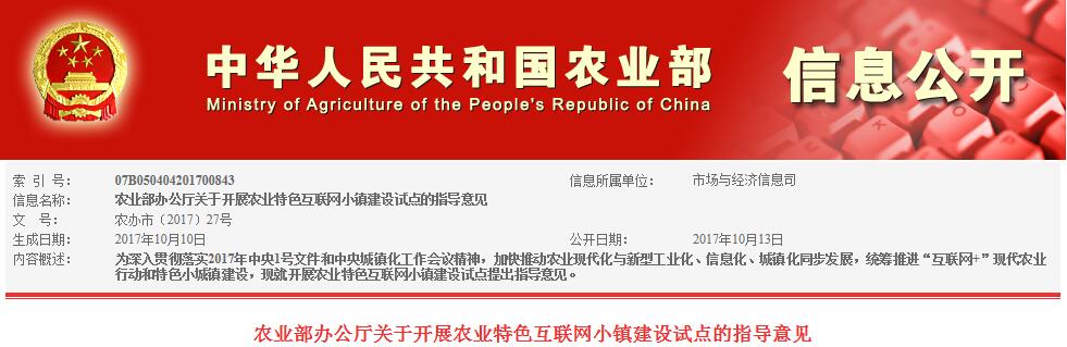 为深入贯彻落实2017年中央1号文件和中央城镇化工作会议精神,加快推动农业现代化与新型工业化、信息化、城镇化同步发展,统筹推进“互联网 ”现代农业行动和特色小城镇建设,前期,我部对农业特色互联网小镇建设试点作出了初步安排。为进一步规范农业特色互联网小镇建设,厘清建设的总体思路、融资模式、重点任务和机制路径,现就开展农业特色互联网小镇建设试点提出如下指导意见,请认真贯彻落实党中央、国务院决策部署并结合当地实际,按照本文件要求扎实推进农业特色互联网小镇建设。