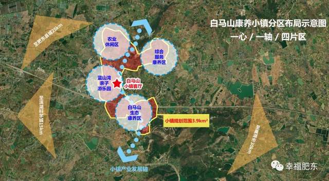 肥东县相关人士介绍,近年来,白马山康养小镇结合地方特色文化,强化运动、养生、养老、亲子、休闲、美食等功能,形成了“一心一轴四片区”空间布局。其中,“一心”为白马山小镇客厅,“一轴”为小镇产业发展轴,“四片区”分别为白马山生态康养区、蓝山湾亲子游乐园区、综合服务康养区、农业休闲区。