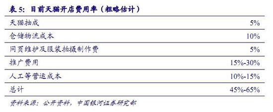 在天猫平台抽成、平台引流广告费用与日俱增的情况下,各大品牌广告费用率也逐步上升。如电商品牌韩都衣舍,其推广费用占总收入的比例已超过 10%,而其众多子品牌的推广费用大多占总收入的 20%-30%。