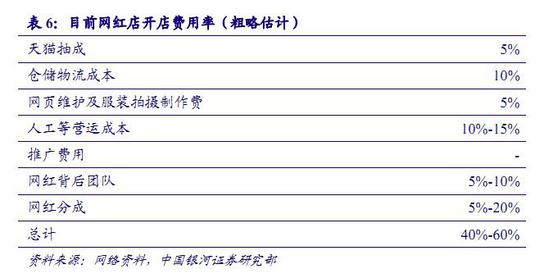 注:lin 家一个网红的背后支持运营团队的费用支出达到 100万;若以如涵公布的数据计算,其公司旗下有 50名网红,公司一年销售额接近 5亿,可粗略得出网红背后团队费用率为 5000万/5亿=10%