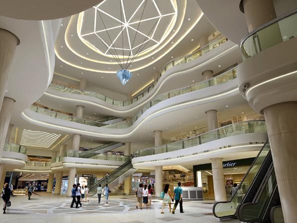 中庭是垂直式购物中心不可或缺的元素,也是中庭环绕式动线概念中的核心空间元素。中庭环绕式动线最大的优点是商铺展示性好。因为中庭的通透性、景观性,使得消费者视觉感受更佳,视角更宽广,利于商铺充分展示。