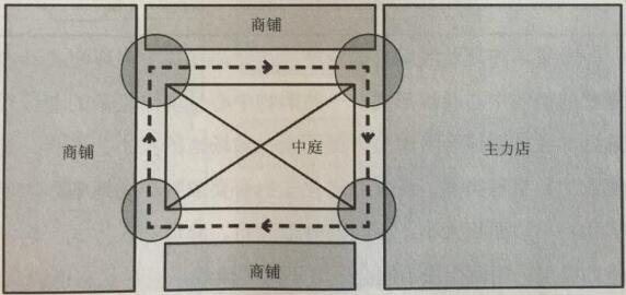 这种动线是围绕中庭的环状动线,与环形动线的差别在于:环形动线的两侧都有商铺,而中庭环绕式动线只有一侧连接商铺,另一侧面向开敞的中庭(见下图)。