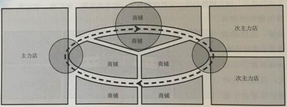 环形动线也是线性动线的一种演变,即主动线多次转折、回旋形成环形回路,店铺布局在环节主动线的两侧,消费者沿环路可经过所有的店铺(见下图)。环形动线延展性长、洄游性好、店铺展示性好,但是相对于线性动线,消费者在同一点上出现两种方向的选择性,导向性略差。