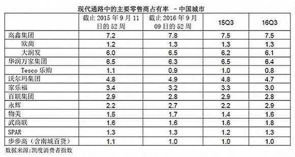 根据凯度消费指数发布的主要零售商市场份额占有率,在去年第三季度,大润发、华润万家、沃尔玛、家乐福、百联等零售巨头的市占率全部处于下滑状态,零售业亟需转型。