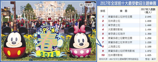 世界主题娱乐协会(tea)及aecom最新公布的「2017全球主题乐园和博物馆报告」,开业还未满2年的上海迪士尼乐园,去年以1,100万的入园人次,跻身全球主题乐园排名榜前10,位列第8位。报导并预估,2020年大陆将跃居全球最大主题乐园市场。