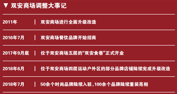 据双安商场方面介绍,早在2011年,双安商场就已经进行过升级改造。在已有dior、雅诗兰黛、la fee等一线品牌的基础上,又增加了爱马仕、卡地亚、蔻驰、hugo boss、weekend by maxmara等不少知名高端品牌。此外,还调整了品牌分区、店堂陈列等个性化特色。服务设施也进行了升级改造,如新建母婴室及儿童娱乐区,服务中心也新增服务项目。在餐饮方面,也引入呷哺呷哺、味千拉面、和合谷等餐饮品牌,以迎合消费者需求。