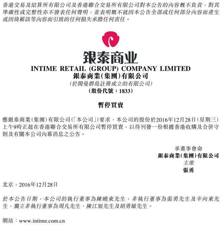 昨日,港股银泰商业发布《暂停买卖》公告。公告称,银泰商业将于2016年12月28日上午九时正起暂停买卖,与公司有关的所有结构性产品亦将同时暂停买卖。