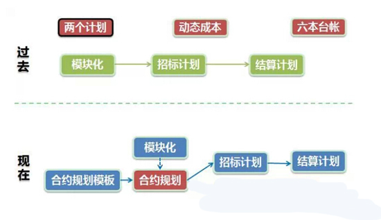 如下图所示,过去根据模块化编制招标计划,容易有漏项;结算计划和招标计划需要单独编制。现在依据合约规划能够生成招标计划,待发生成本台帐;合约规划模板提供了多年万达商业地产成本管控经验;依据模块化及招标计划,进行结算计划的编制。