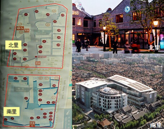 南里:以反映时代特征的新建筑为主,包括一座总建面达2.5平米的购物、娱乐、休闲中心,配合少量石库门建筑。