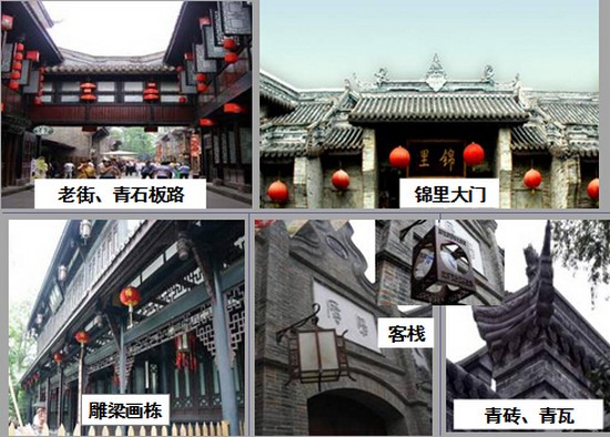 根据依附的地理空间所承载的文化内涵来确立建筑的主题,锦里外部为明清古建筑风格,与武侯祠现存的清代建筑融为一体。