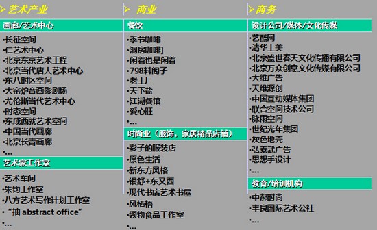 798进驻机构除了画廊/艺术中心/工作室外,餐饮业、时尚业、媒体产业、设计/广告公司目前在园区中已经占有很大的比重。