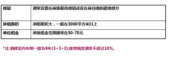 大型中式酒楼——承租水平低,要求面积大,但可提供消费者休憩、餐饮场所,是购物中心必要因素,一般放至最高楼层。