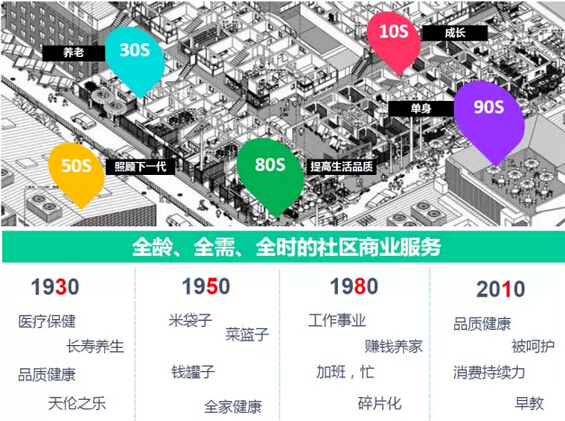 根据现有的社会结构分析,社区消费已呈现全龄、全需、全时的“3581”定律(即按照四世同堂的结构,生于30年代的曾祖辈、50年代的祖父辈、80年代的父母辈及2010年后出生的子女辈)。70/80后作为家庭经济收入的主要来源,由于工作繁忙平时无暇逛街,更青睐使用电商、购买高客单价产品;老老小小为主的“351”人群,却有闲暇光顾社区商业,把握着家中的采买大权,他们,必买菜、需保健、爱早教、能理财。